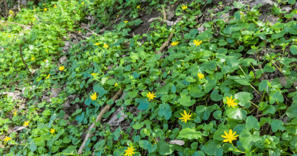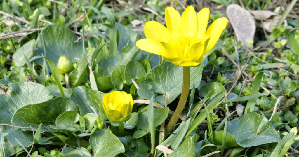 - Lesser celandine, forming bright yellow carpets along paths and banks