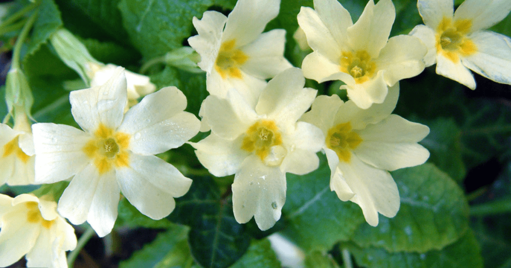 - Primroses, found in hedgerows and woodland edges